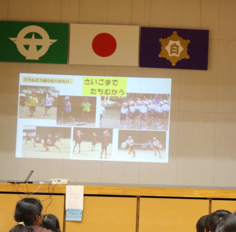 運動会の振り返りでは、スローガンである「最後まで笑顔で立ち向かう」様子を写真等をもとにふりかえりました。