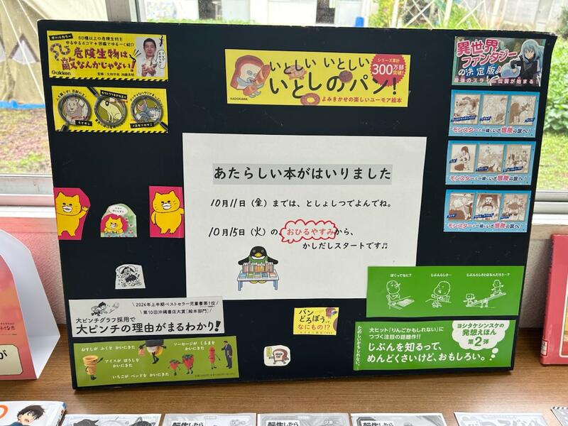 図書室では、「新しく入った本」や「先生からのおすすめの本」の紹介がしてありました。