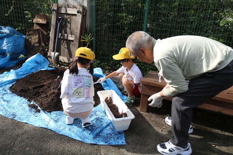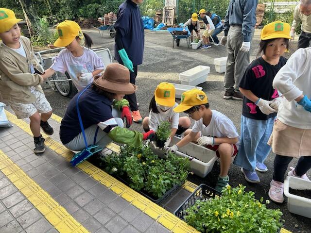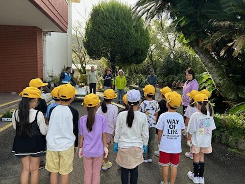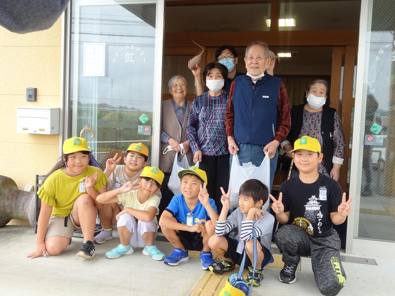 「地域の方に、おいもをプレゼントしてきます!」と、子供達は先生方と一緒に学校の近くの緑風苑とサポートセンター虹へ向かって出発しました。