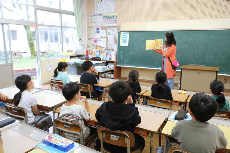 5年生の英語の授業を見学しました。英語専科の安田先生がジェスチャー(身振り手振り)を付けて教えます。