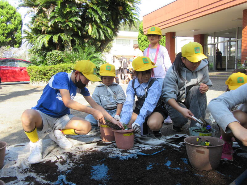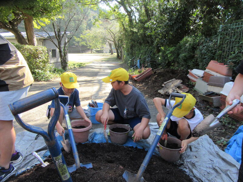 今日は、3・4年生が楽しみにしていた「いもほり」がありました。毎年(長年)、糸田の緒方さんの畑で、芋の苗植えと芋掘りをさせていただいています。