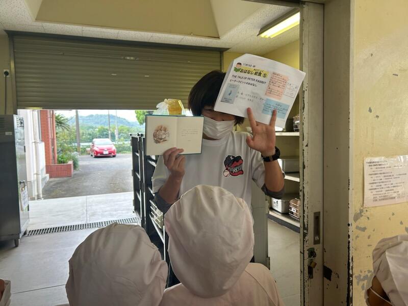 今週の給食は、町図書司書の小原先生と、甲佐小栄養教諭の永岡先生のコラボ企画、「お話給食」があっています。