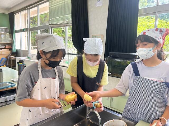 7月4日(木) 5年生は調理実習で「じゃがバターと小松菜のおひたし」をつくりました。ピーラーでじゃがいもの皮をむいている様子を見ると、恐る恐るむく子もいました。「ピーラー使ったことある?」と聞くと、「にんじんはむいたことがあります」と…。慣れてる子はシャッシャッとむいていきます。「じゃがいもの芽の所もちゃんとむいてね~」担任の指示がでます。みんなとても楽しそうに次々に手際よく進めていました。