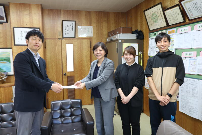 1つ目は、町社会福祉協議会から市丸様、町地域福祉推進員連絡協議会から渡邉様が来校され、「車椅子」の寄贈がありました。渡邉様は、昨年度から、低学年児童の下校の見守りを老人会の中心として行ってくださっています。