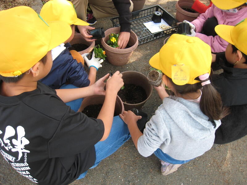 その後は、縦割り班ごとに名前が書かれた鉢を手に取り、土を入れ苗を植えていきました。各班とも1年生~6年生までがいるため、土を入れたり運んだりする際、6年生を中心とした上級生が低学年の子どもたちに優しく声を掛ける姿など心温まる光景が至るところで見られました。花植えが終わったものは、正門の橋のたもとにきれいに並べました。先週、民生委員さん方と1年生で植えたプランターの花とともに来校された方々をきれいな花でお出迎えしていきたいと思います。