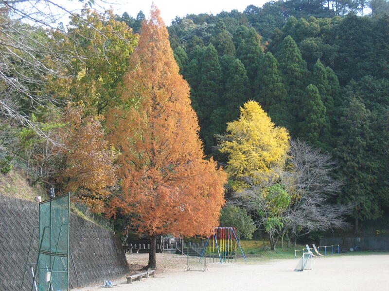11月22日にも紹介しましたが、本校の運動場北(白旗山)側にはメタセコイアという大木があります。秋の深まりとともに日に日に赤く色づき、ここ数日の雨等の影響で一気に赤みが増しました。また、メタセコイアの先には黄色く色づいた銀杏の木もあり、奥の緑とのコントラストが何ともきれいで、心を癒やしてくれます。ほんとうに素敵な環境の白旗小学校です。