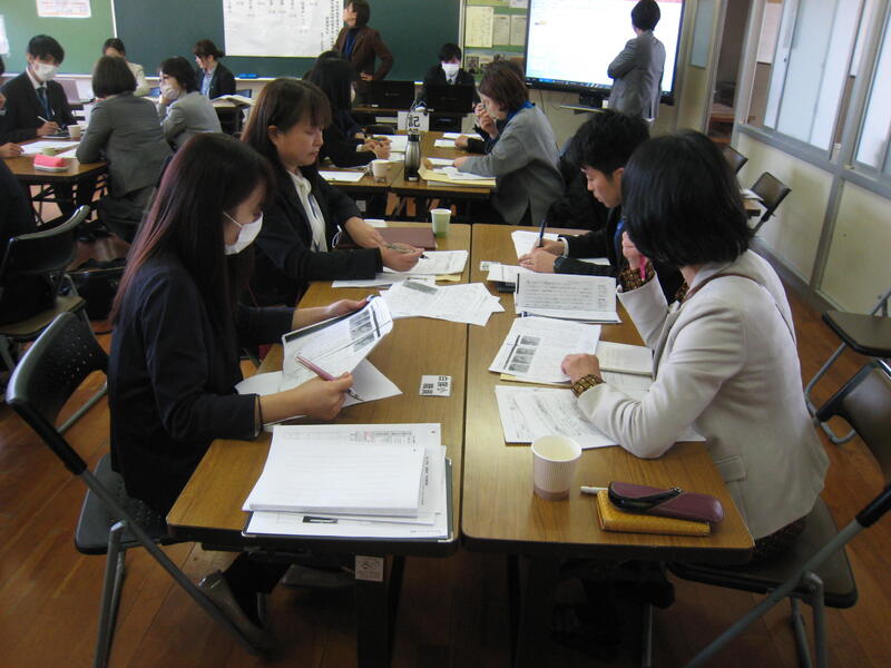 【授業後の先生方による積極的な意見交換】 【永松指導主事からの説明】