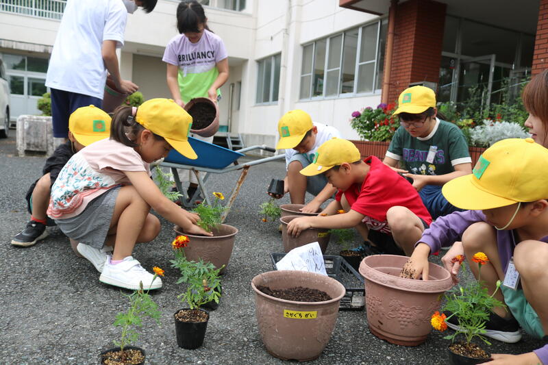 今日は、第1回目ということで、各班ごとに自己紹介を行った後、一人一鉢ずつ、マリーゴールドの苗を植えました。マリーゴールドの苗は、今年の2月から、寺尾先生が種から育てたもので、立派な苗になっていました。上級生が下級生に教えながら、苗植えを行うことができました。