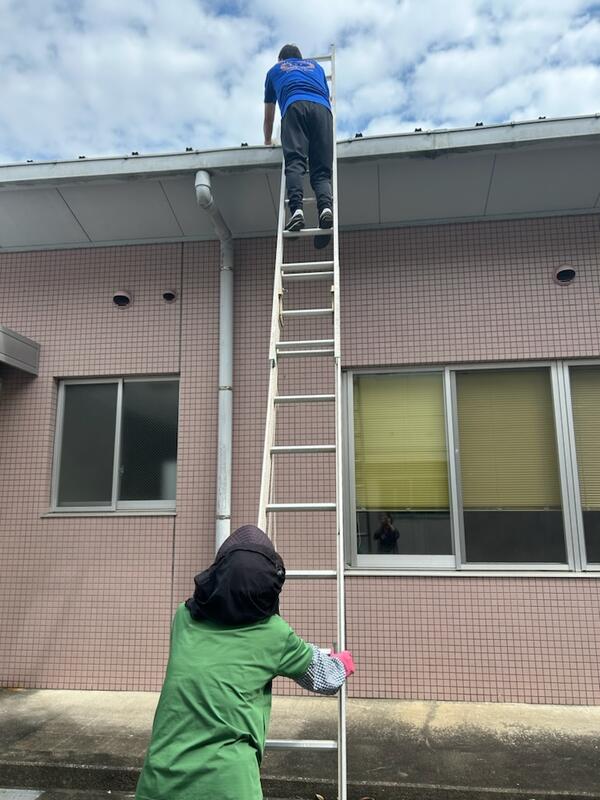 「梅雨」前に、雨樋にたまった落ち葉やゴミを取り除くためです。以前、大雨が降り、落ち葉等が樋に流れ、雨漏りを起こしてしまうことがありました。事務の先生や学校主事の先生は、子供達が使う施設を守るためにも、様々なお仕事をしてくれています。