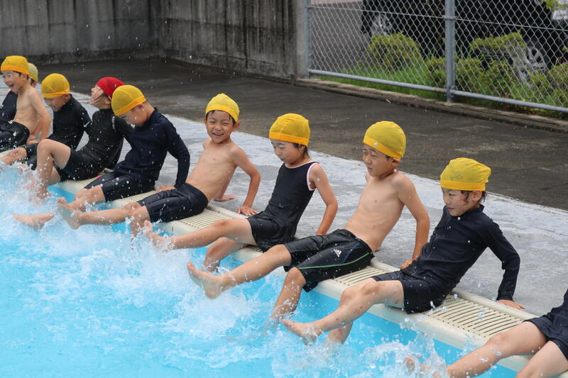 シャワーをあび、水の中に顔をつけたり、かにさんのようにぶくぶくしたりと、楽しく学習を行っていました。今日は、蒸し暑かったこともあり、子供達は、「きもちいい!」と話していました。