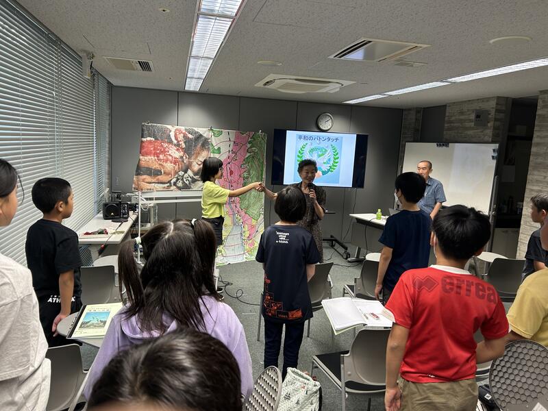 美味しい昼食をすませ、資料館を見学した後、被爆者である八木さんの講話を真剣に聞いた子供達。八木さんは、「戦争は全てをなくしてしまう。絶対してはならない。戦争のない平和なくらしを続けるために、まずできることは、友達を大切にすることです。何かあったら話し合って解決してください。」と話され、平和のバトンを渡すよと子供達と握手してくださいました。フィールドワークでは、ガイドさんが雨の中でしたが、子供達に丁寧にお話をしてくださいました。