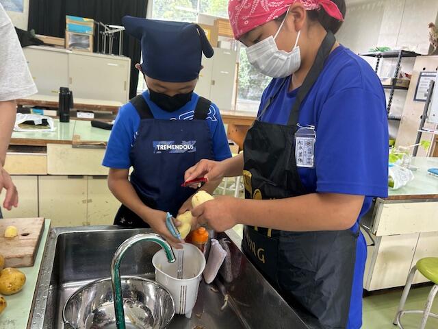 7月4日(木) 5年生は調理実習で「じゃがバターと小松菜のおひたし」をつくりました。ピーラーでじゃがいもの皮をむいている様子を見ると、恐る恐るむく子もいました。「ピーラー使ったことある?」と聞くと、「にんじんはむいたことがあります」と…。慣れてる子はシャッシャッとむいていきます。「じゃがいもの芽の所もちゃんとむいてね~」担任の指示がでます。みんなとても楽しそうに次々に手際よく進めていました。