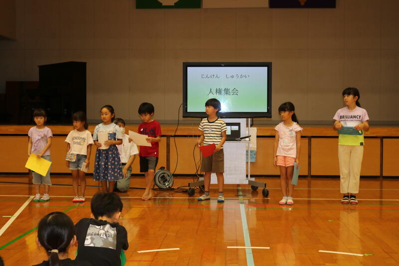 7月2日に人権集会をしました。各学年から、人権学習をして学んだこと、考えたことの発表がありました。子供達は、「いやなときやおかしいことがあったら、『やめて』『だめだよ』と言いたいです」「たしかめもしないで、勝手に決めつけてはいけないと思います」「平和な世の中にするために、友達や家族を大切にします」と発表してくれました。