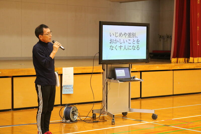 発表の次に、人権主任の寺尾先生から、人権学習は、3つの力「おかしいことに気付く力」「いやなことはいやと言える力」「周りの人や大人に相談する力」を身に付けるために学習するということや、差別をしない人になってほしいと話がありました。