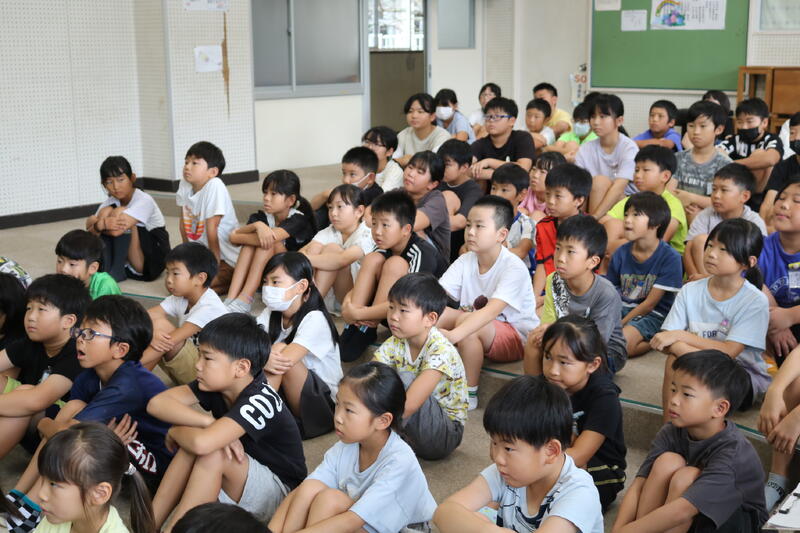 この取組は、甲佐町で毎年行われているものですが、今日は3名の中学生と、先生が来校されました。甲佐中から来た生徒は、中学3年生で、本校の卒業生でした。とても礼儀正しく、大きな声で本校の児童へあいさつをしてくれました。今週の9月5日に、残りの1回が予定されているようです。