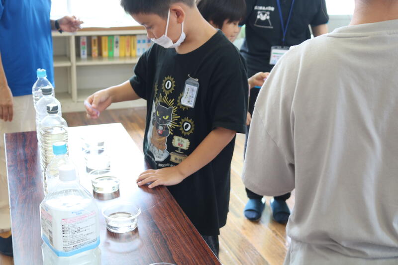 4年生は、泉さんの話をよく聞きながら、洗剤が入った水、しょうゆが入った水、川の水などの状態を調べる活動を行っていました。
