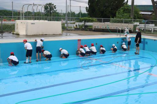 水泳の学習に向けて、プール掃除を行いました。今年度は、例年と異なり密をさけるため、学年毎に掃除を進めていきました。子どもたちの頑張りのおかげで、プールがきれいになりました。