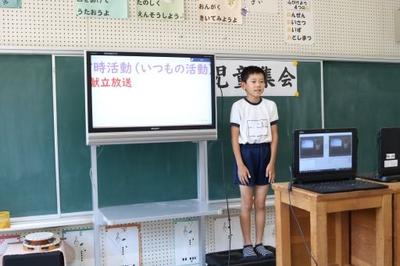 今年度初めての児童集会をリモートで行いました。児童会長をはじめ各委員会の委員長が、今年度の活動の概要や目標を全校に伝えました。