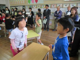 子どもたちは、学級の友だちよりも多くの先生方に見られ、緊張しながらもしっかりと外国語活動をすることができていました。