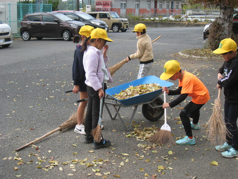 そんな中、5時間目。職員室で仕事をしていると2年生の子どもたちと担任の宮田先生の声が聞こえてきました。見に行くと、児童玄関前の樹木の落ち葉掃きをしてくれていました。今日は時折、強い風が吹いていて、そのたびにパラパラと葉が落ちてきます。せっかくきれいに掃いてもすぐに一面葉っぱだらけに。しかし、2年生の子たちは何回も何回も竹ぼうき等を使って掃いてくれます。来られる方に少しでもきれいな白旗小を見てほしいとの思いから行動に感動してしまいました。ありがとう!! 2年生。