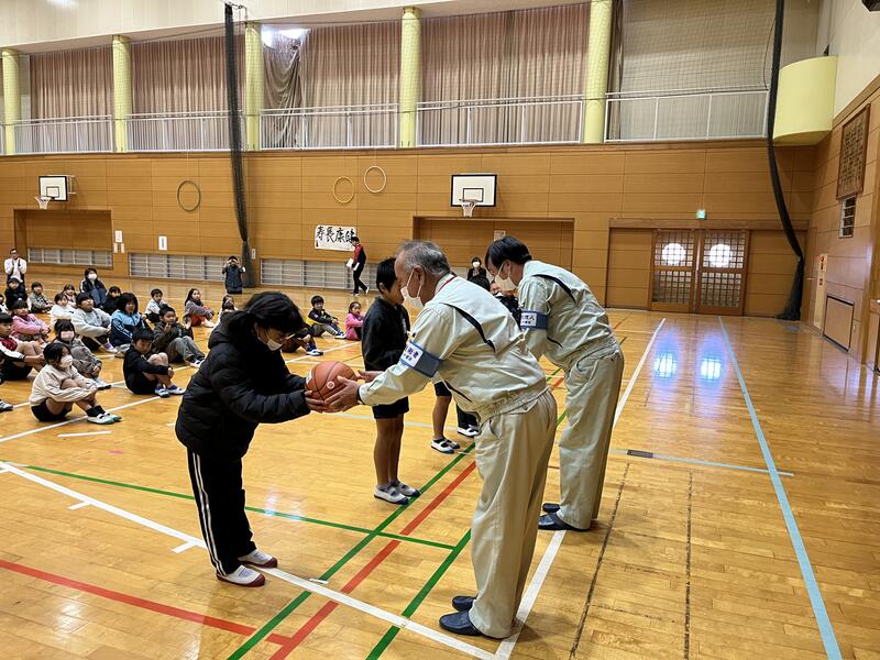 この日は、八十建設 様と熊本ヴォルターズ 様より4名が来校され、体育館で各学年代表児童にボールを寄贈されました。いただいたバスケットボールは今後、体育の時間等で大切に使っていきたいと思います。