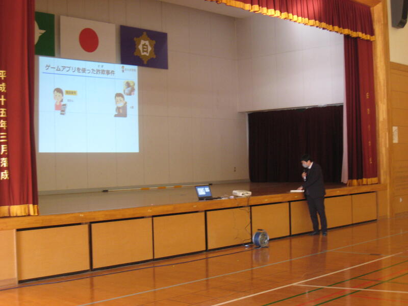 さて、バザー後は、体育館で御船警察署の園田様を講師として【SNSに関わる危険性】について5.6年生児童と保護者向けにお話をしていただきました。冬休みを前にして、改めて使う側の注意点等々について貴重な学びの時間となりました。
