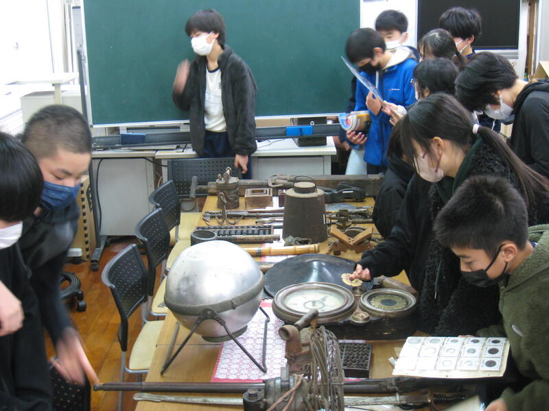 以前、お伝えしましたが、2学期に甲佐町在住の坂野様から『世界のお金』を町内各小学校に寄贈していただきました(現在、児童玄関に掲示)。今回は、子どもたちにも見てもらえたらという思いで、『江戸』『明治・大正』『昭和初期』に使われていた道具(戦いにも使われた武器等々)を1日限定でお借りしました。