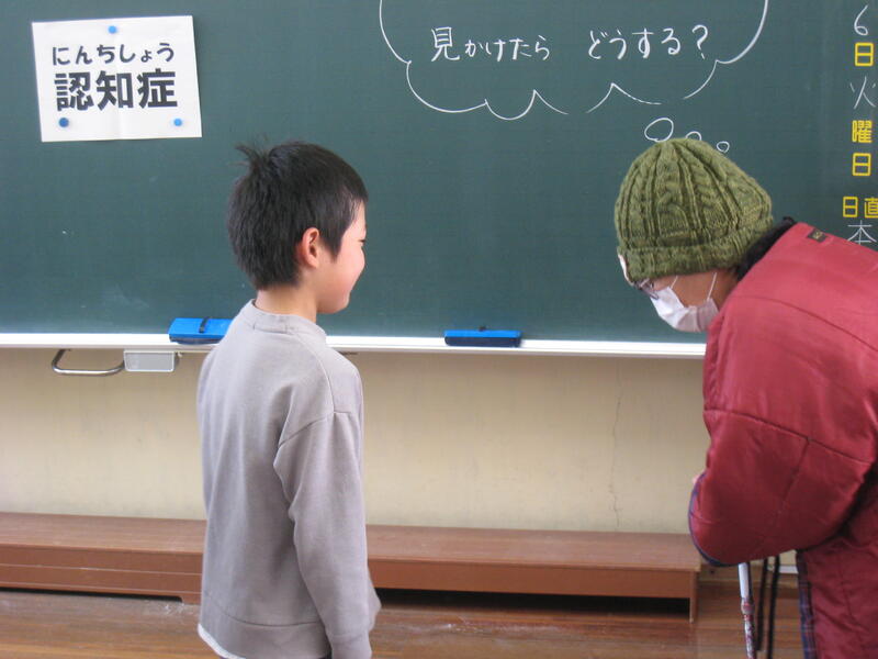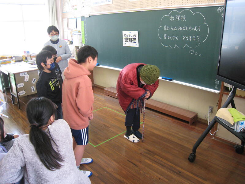 本日、甲佐町福祉課等から4名の方々が来校され、4年生の子どもたちへ『認知症サポート事業』の一貫として『認知症の方へのサポートの在り方』について学習を行いました。まず、認知症についての基本的なことを確認し、その後ロールプレーなどを通して声かけ等の対応について学びました。
