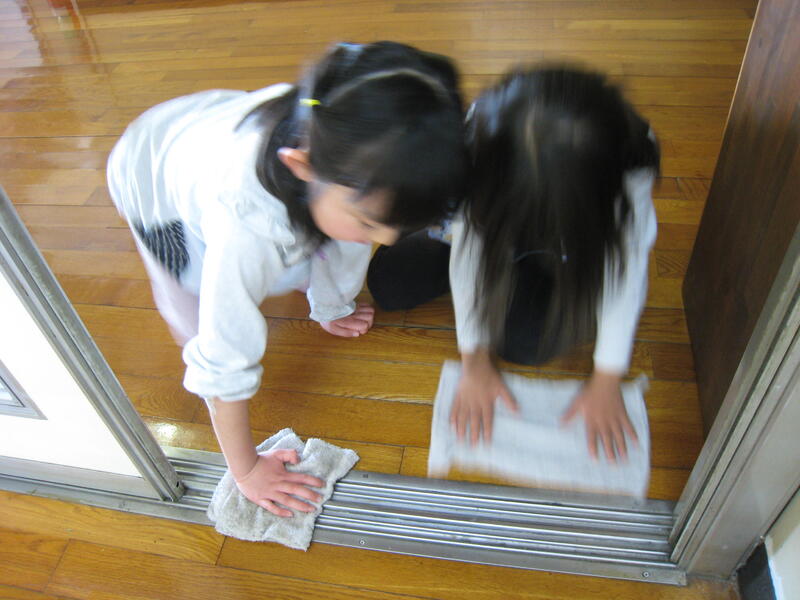 今、職員室前は1年生が掃除してくれています。今日の掃除時間、ふと職員室入り口を見てみると、ドアのレールをきれいに拭いてくれている姿が見えました。丁寧に丁寧に拭き取っている姿に改めて感心するとともに、白旗小の誇れる一つが見えた時間でした。