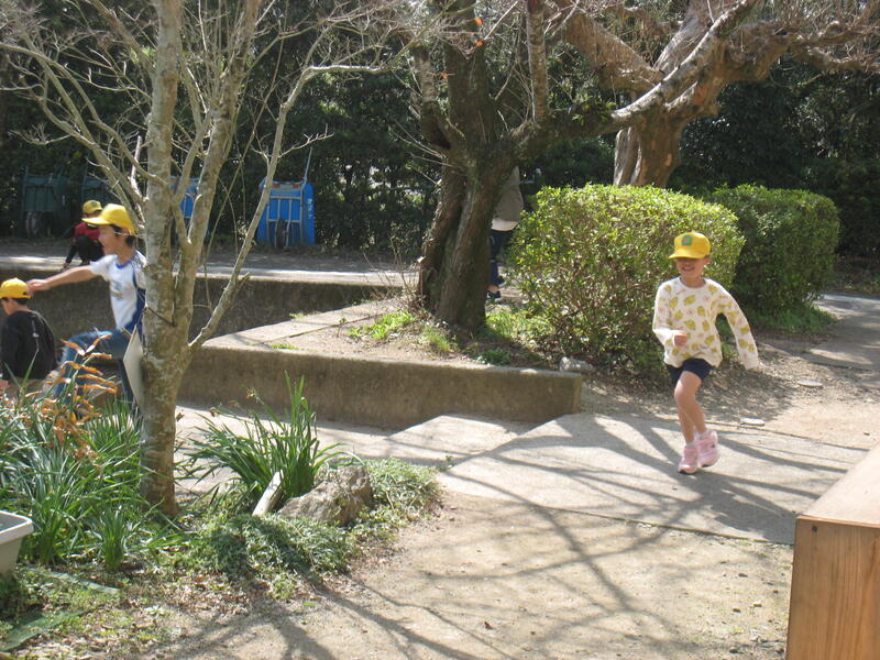 【菜の花いっぱい】 【おいしいお弁当】 【友だちとのおしゃべり】 【食後は、先生も鬼ごっこ】