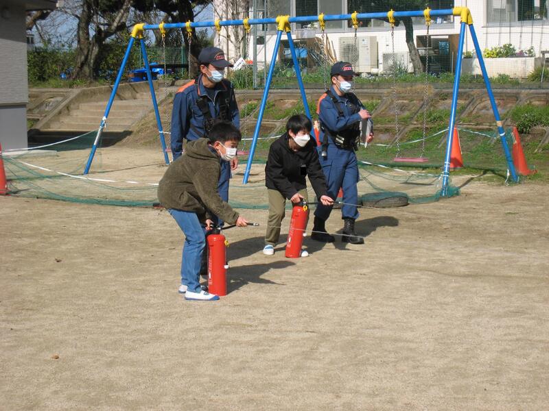 消防士の方からは、子どもたちの避難の様子がよかったと褒めていただきました。また、消化器の使い方では、5年生と6年生代表児童が実際に練習用の消化器を使った体験を行いました。