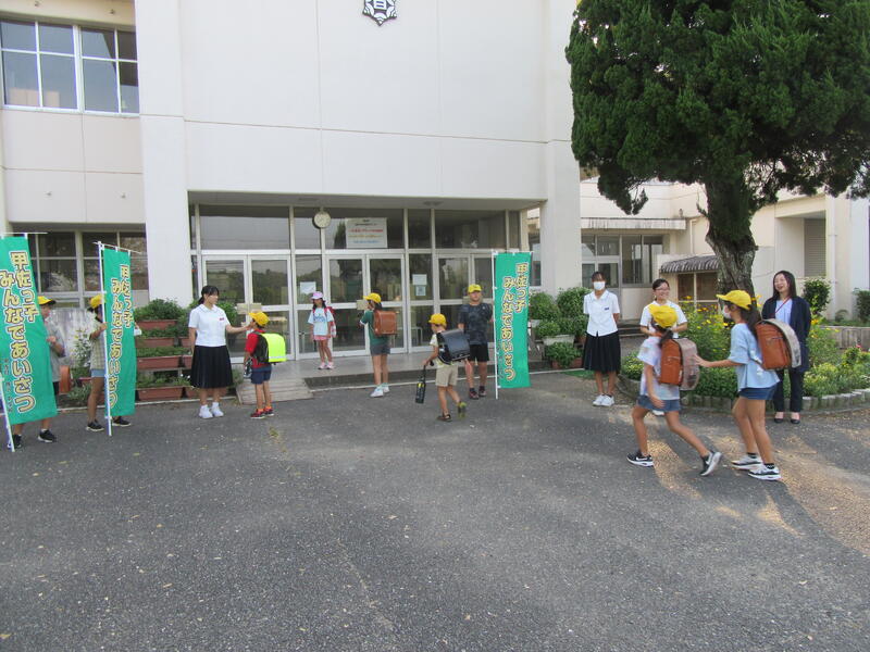 今日のあいさつ運動も、甲佐中生徒と先生が来校し、子ども達と挨拶を交わしてくれました。子ども達も元気いっぱい挨拶を返していました。