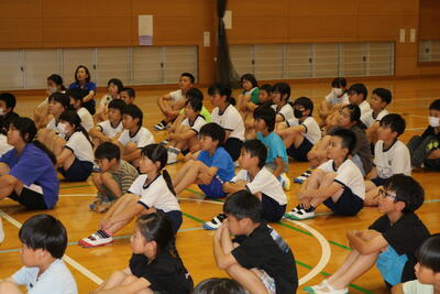 本校では26年前に水の事故で2名の児童が命を落としました。その事故をきっかけにして毎年この集会を行っています。今年は5回を予定しています。今日は、今年1回目の集会でした。最初に寺尾先生がこの集会を行うようになったいきさつを話されました。