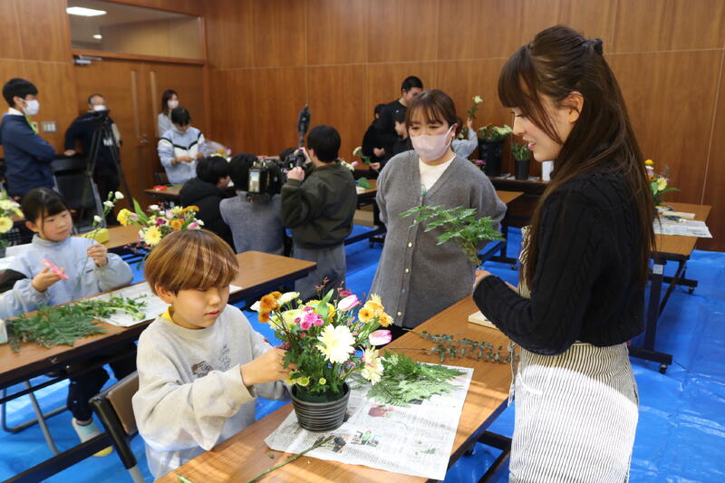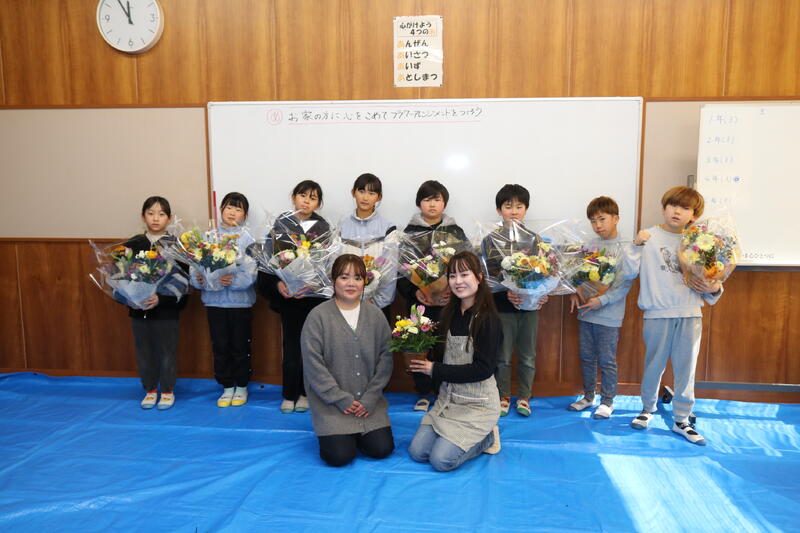 4年生では、地域の「誠フラワー」さんと協力し、年間を通した「花育」活動を行ってきました。自分たちで植えた苗をプロのハウスで大切に育てていただき、立派に成長した花を使って、自分たちの手でフラワーアレンジメントを製作しました。