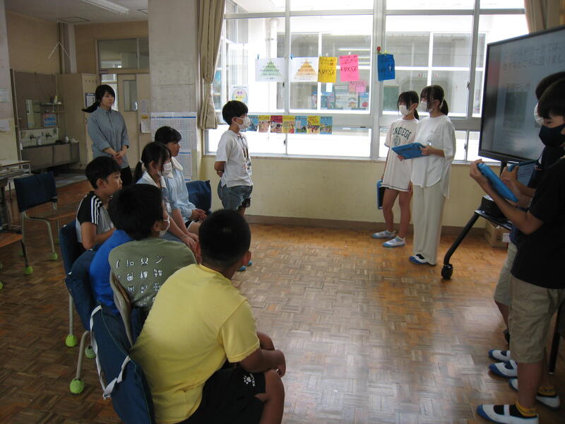 6月15日(木)から1泊2日の日程で長崎へ修学旅行に行った6年生。あれから約3週間たった7月4日(火)の4時間目、6年生の子どもたちはグループごとに長崎で学んだことを5年生へ伝えていきました。5・6年生の2教室に分かれて、タブレットを手に、まとめた内容を電子黒板にとばしながら説明していきました。