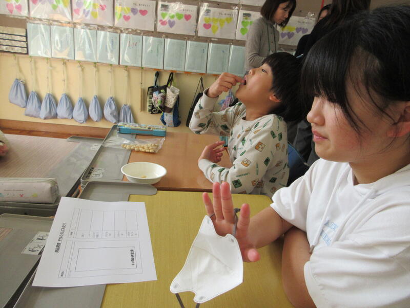 本日の5~6校時に、木村のあられさんから3名の方が子どもたちが考えた味のあられを持ってこられました。唐揚げ味、きなこ味、ピリ辛めんたいたこ焼き味、にんにくごま油味 等々、聴いただけでワクワクするような味で、早速試食をした子どもたち。あちらこちらから歓声があがっていました。その後、パッケージデザインを班ごとに考えていきました。