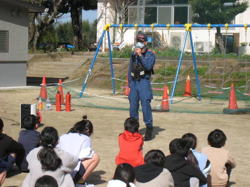 消防士の方からは、子どもたちの避難の様子がよかったと褒めていただきました。また、消化器の使い方では、5年生と6年生代表児童が実際に練習用の消化器を使った体験を行いました。
