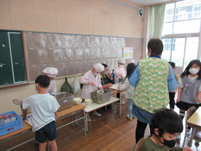 今日のメニューのタケノコご飯。子供達は「おいしい!」とニコニコ笑顔で食べていました。給食の準備もみんなで協力して上手にできていました。さすが白旗っこです!