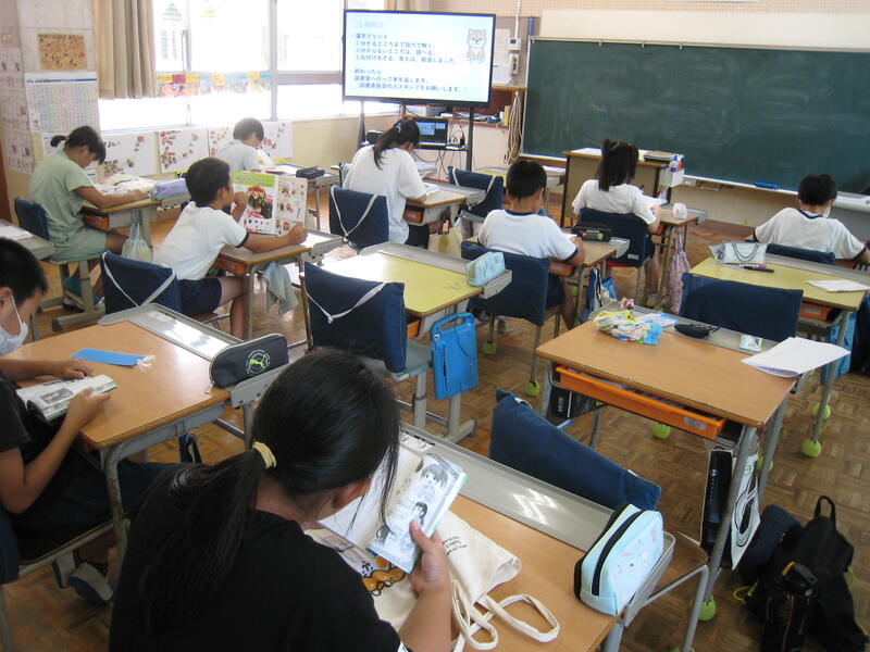 まずは、5時間目に入った5年生。チャイムと同時に教室に向かうと、静まりかえった教室で真剣に漢字の学習に取り組んでいました。そして、漢字のプリントが終わると、提出し、静かに図書室へ向かいます。この間、私語をする人はゼロです。