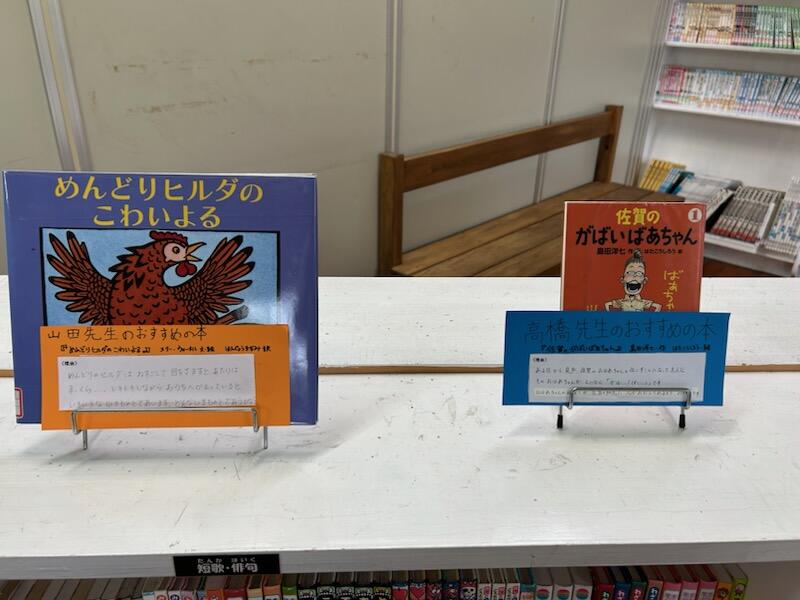 図書室では、「新しく入った本」や「先生からのおすすめの本」の紹介がしてありました。
