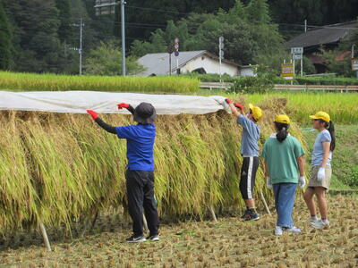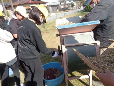 5年生が9月に刈り取った稲を脱穀しました。稲刈り後、掛け干しした稲を機械にかけていきました。