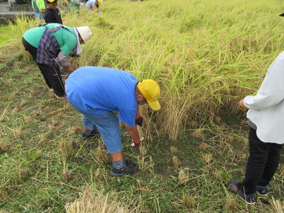 暑い中、地域のシニアクラブの方々に稲の刈り