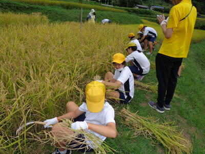 馬見原東部シニアクラブの皆さんのご協力をいただいて、5年生が稲刈りに行きました。