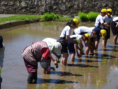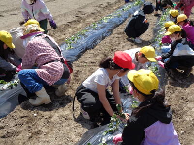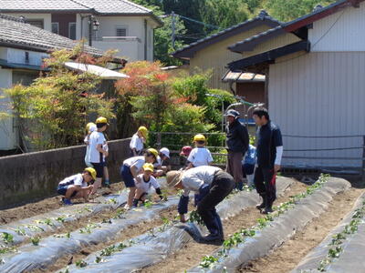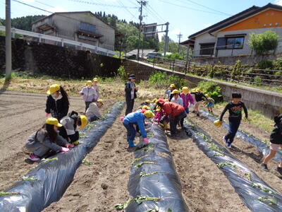 今年の農園活動として、1,2年生は馬見原中央シニアクラブの皆さんのご協力を得て、さつまいもの苗植えを行いました。