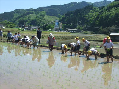 晴天に恵まれ、馬見原東部シニアクラブの皆さんのご指導とご協力を得て、田植えを行うことができました。