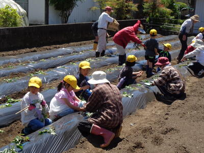 耕耘してマルチを貼っていただいた畑での苗植えを楽しみました。5ヶ月後の収穫が楽しみです。