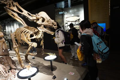 巨大な恐竜の骨格展示を見たり化石採取を体験
