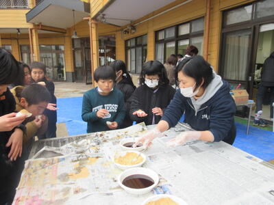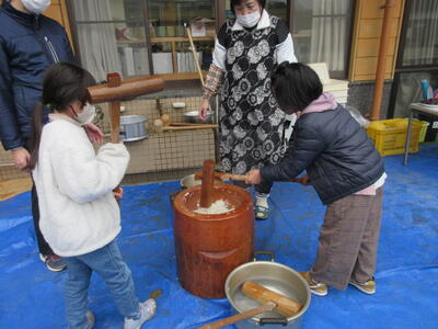 先週、5年生が育てたもち米を使って、もちつ