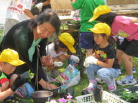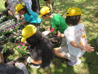 子ども達がプランターに花の苗を植えて、そのプランターで馬見原商店街を花いっぱいにするという「フラワーポット大作戦」。協議会の方にたくさん褒めてもらって、子ども達も笑顔いっぱいでした。
