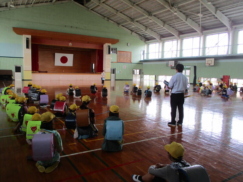 4月27日(水)に交通安全教室を行いました。今回は雨天のため体育館で実施しました。まず、安全な歩行の仕方、横断歩道のわたり方について映像を使って学習し、その後登校班ごとに横断歩道のわたり方を練習しました。今回の交通教室で学んだことは、命を守るための大切な学習です。今後も各学級や一斉下校時などで交通安全の約束について指導していきます。